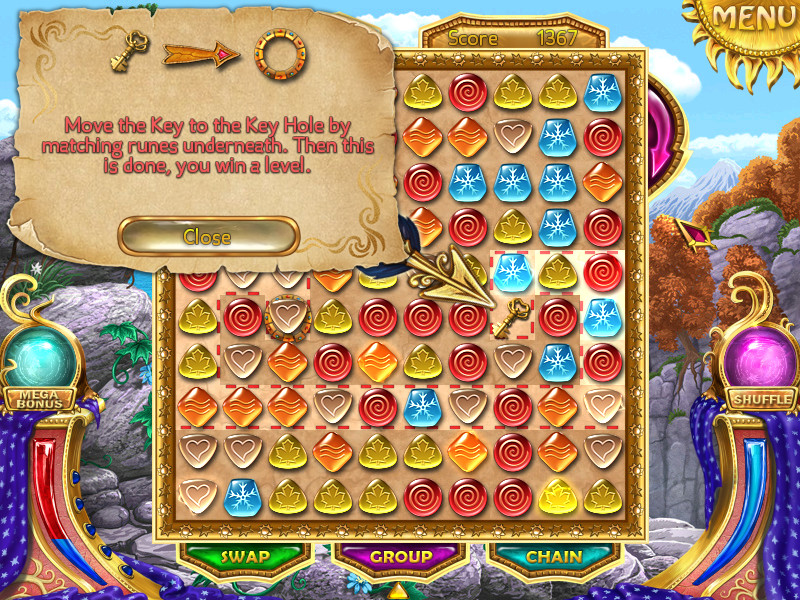 By the way, Wizard Land features some peculiarities that make it much more fascinating than a common match3 game. For instance, it is possible to turn the playing area and thus control where the items come from and where they fall. To complete a level you should destroy all marble plaques and move the key to the keyhole by matching the runes (the key and the keyhole appear only when the marble plaques are destroyed). The key can fall downwards only, but do not forget that the playing area can be turned!